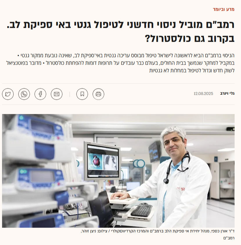 הניסוי ברמב"ם הביא לראשונה לישראל טיפול מבוסס עריכה גנטית באי־ספיקת לב, שאינה נובעת ממקור גנטי • במקביל למחקר שנמשך בבית החולים, בעולם כבר עובדים על תרופות דומות להפחתת כולסטרול • מדובר בפוטנציאל לשוק חדש וגדול לטיפול במחלות לא גנטיות